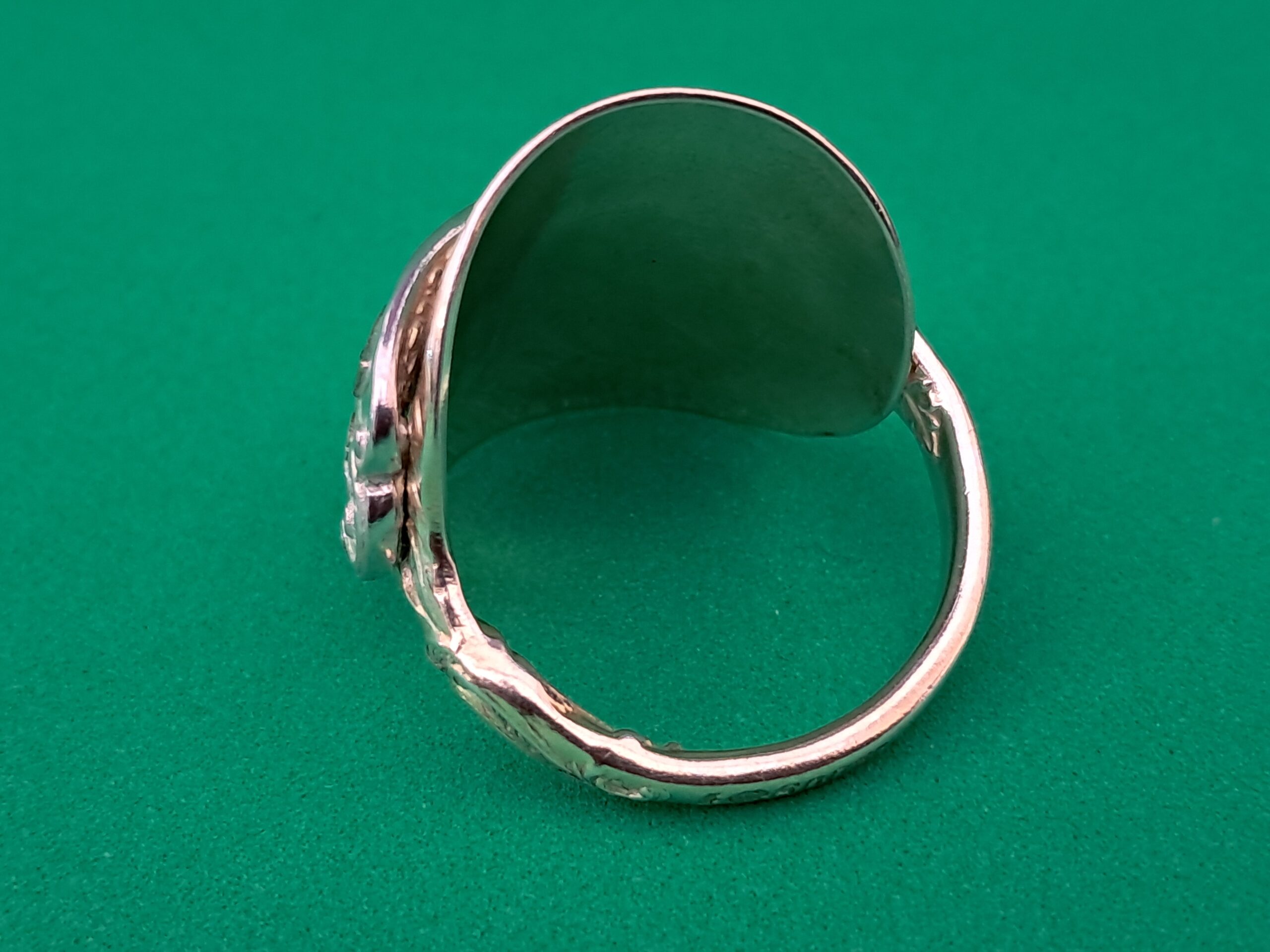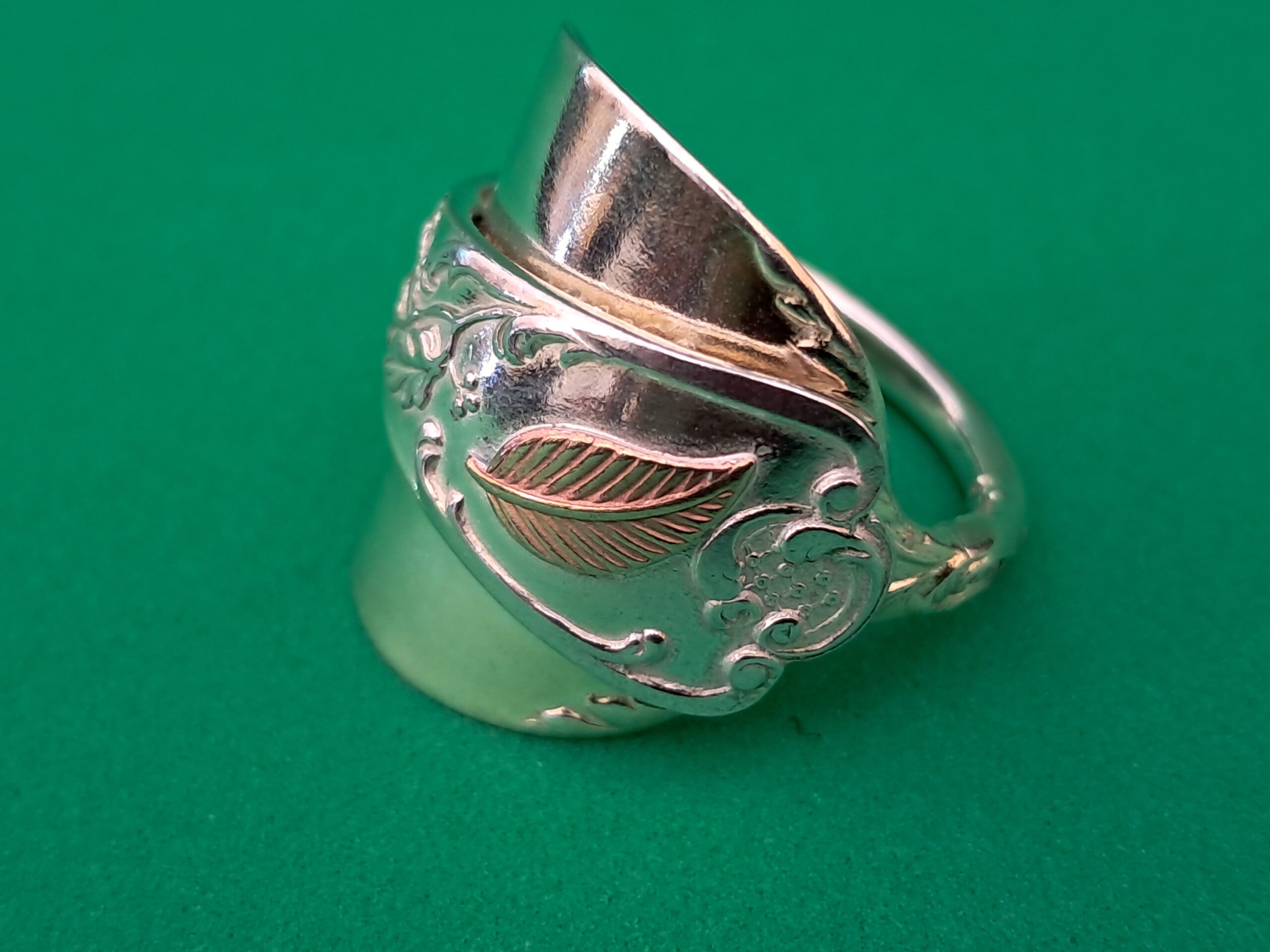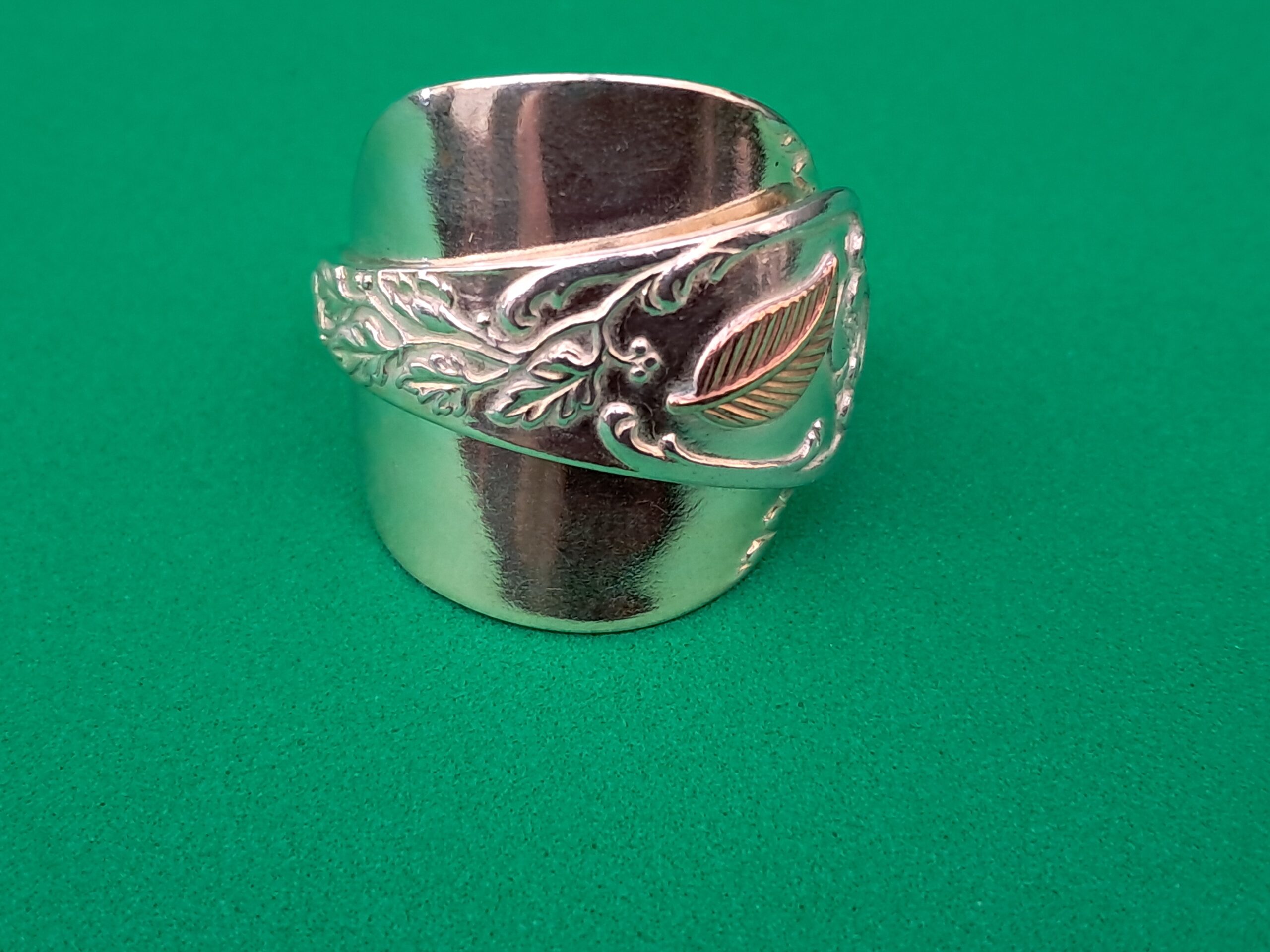 A distinctive detail of this ring is the addition of a copper leaf at the top of the handle, enhancing its decorative appeal and highlighting the craftsmanship involved in its creation. The spoon is marked as “800 silver”, indicating that the metal comprises an alloy with 80% pure silver and 20% other metals, commonly copper. This particular alloy was especially popular in continental Europe for the production of fine flatware and decorative objects from the late nineteenth to early twentieth centuries, valued for its beauty and durability.