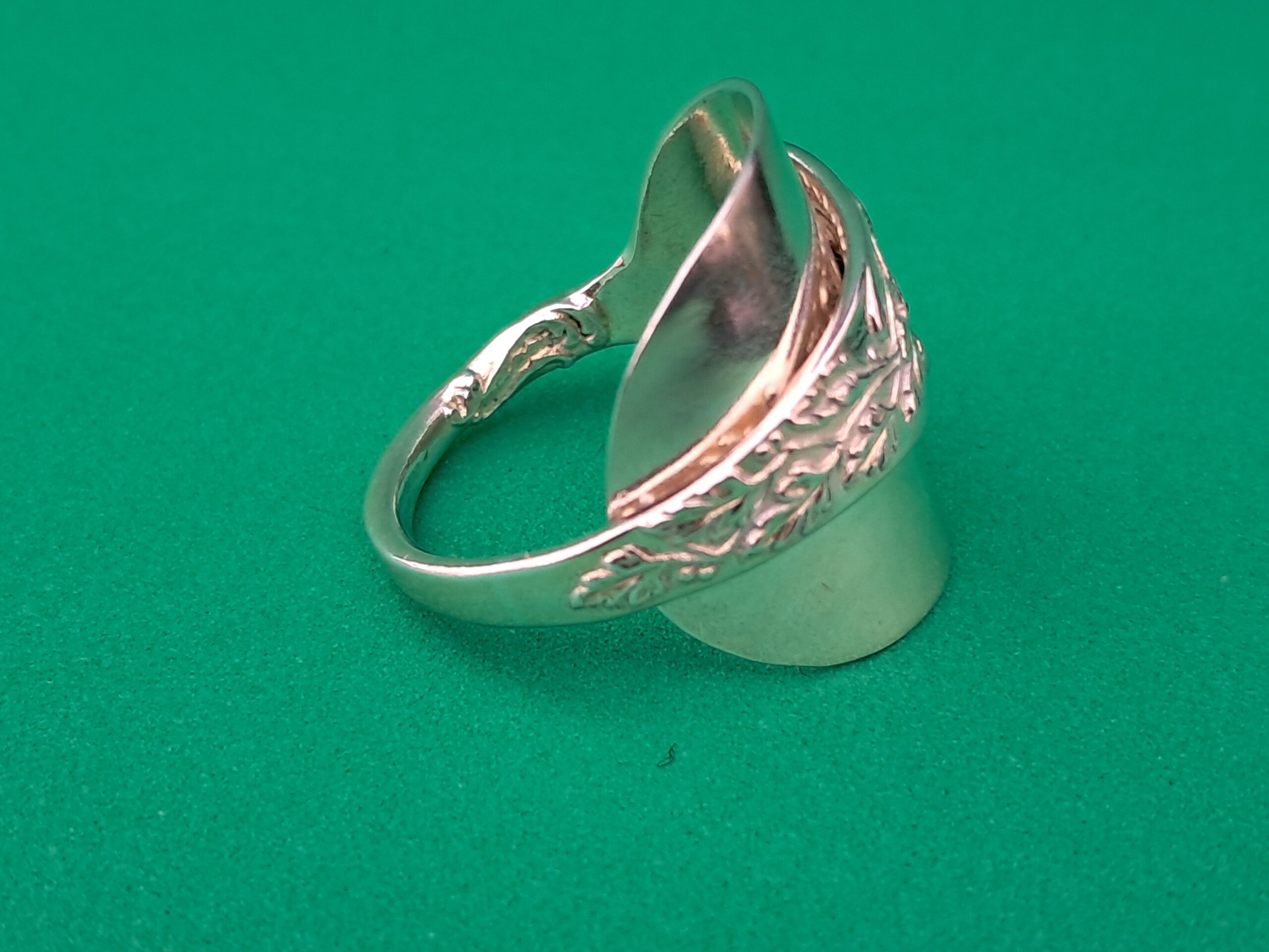 This unique spoon ring has been meticulously crafted from a French teaspoon originating from Paris, dating between November 1809 and 1819. The spoon, made of silver gilt—also known as gilded silver or by the French term vermeil—features a delicate leaf pattern that runs along the handle and extends towards the bowl. Silver gilt refers to a silver item that has been coated with a thin layer of gold, imparting the piece with the opulent appearance of solid gold while retaining the underlying strength and versatility of silver.