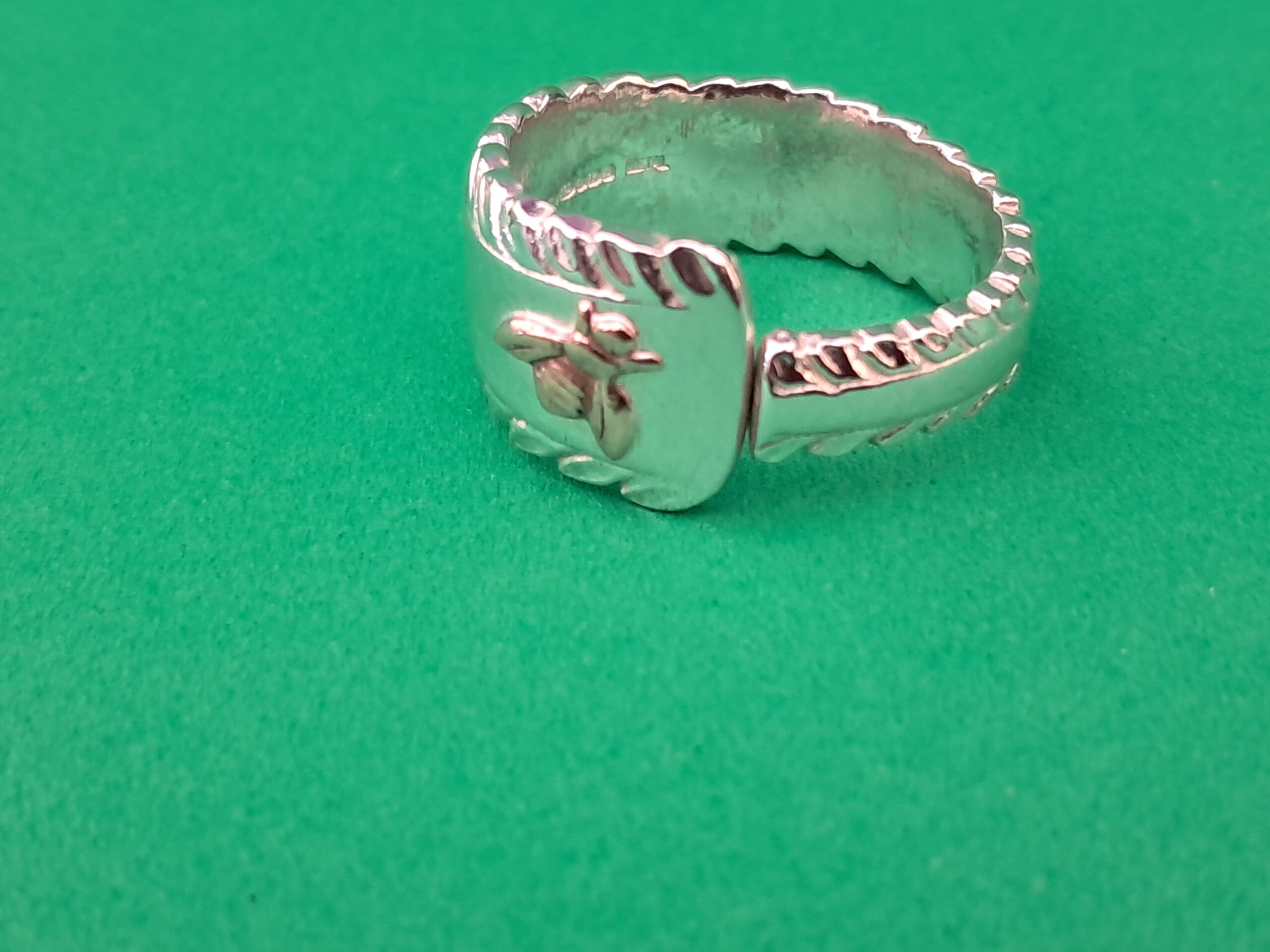 This unique spoon handle ring has been carefully crafted from a solid silver teaspoon dating back to circa 1967-68. The handle showcases an attractive feather edge pattern, lending the piece a delicate and refined appearance. To ensure a more elegant and less bulky design, the bowl of the spoon has been removed, allowing the graceful lines of the handle to be featured prominently.