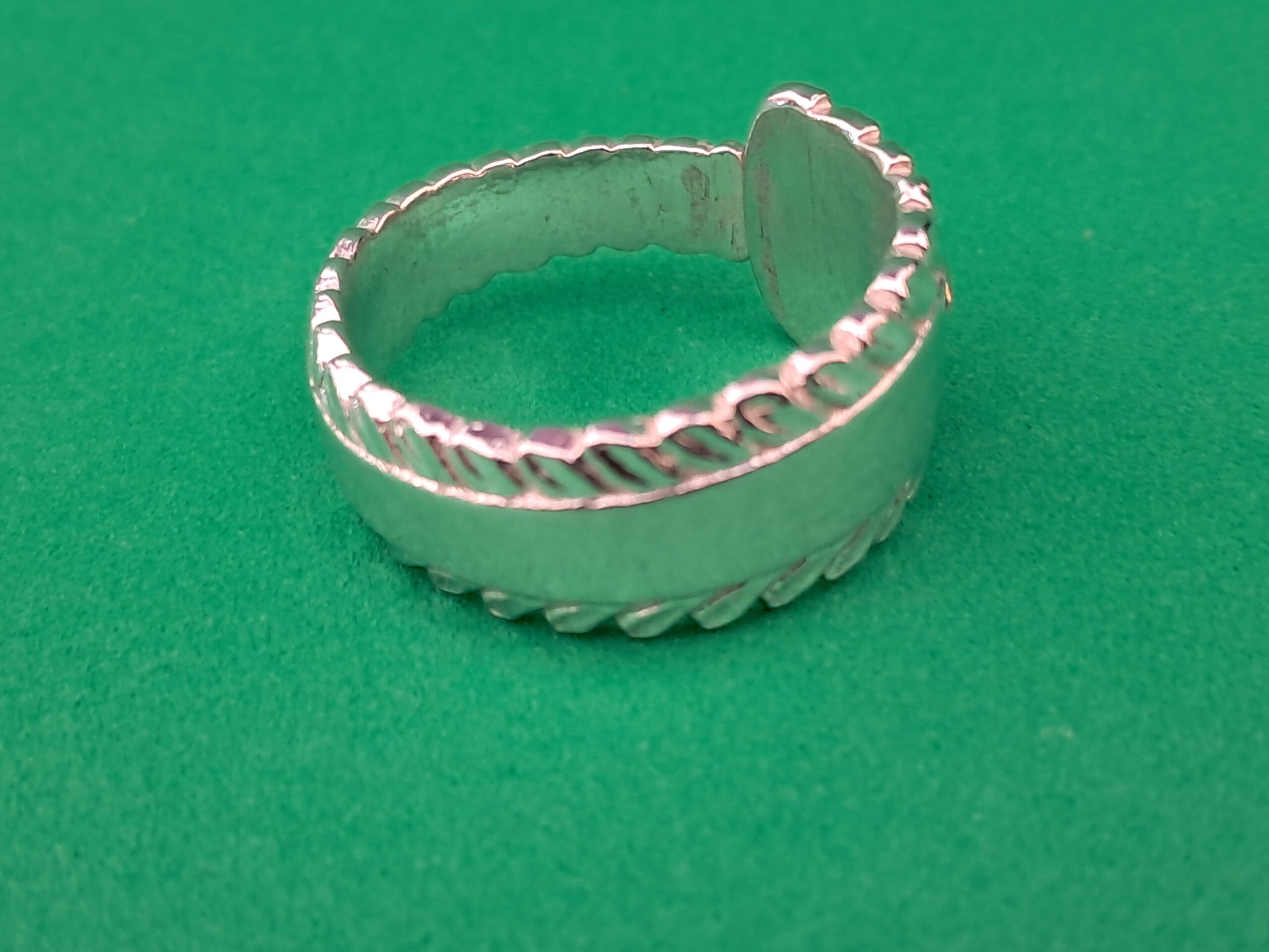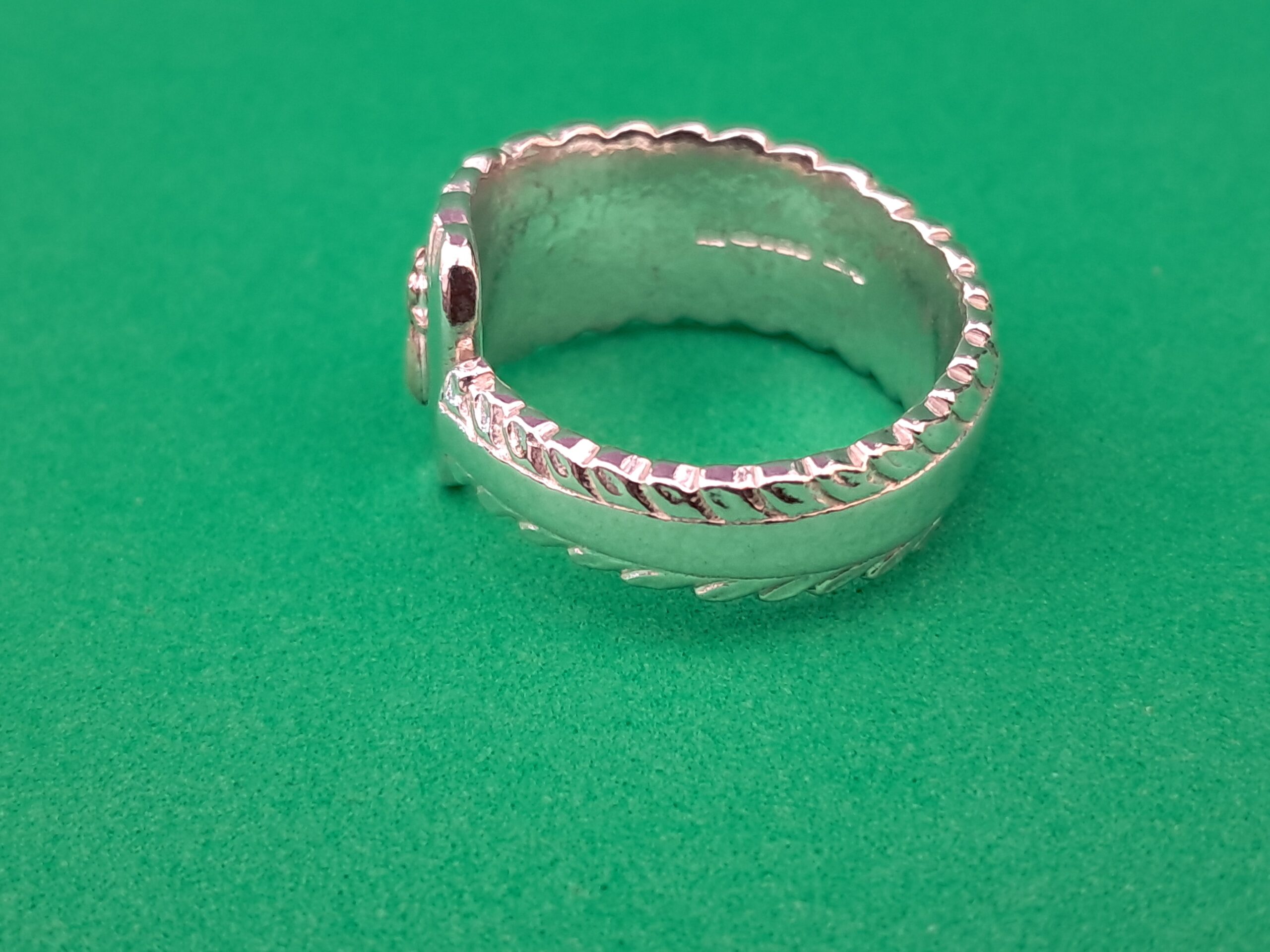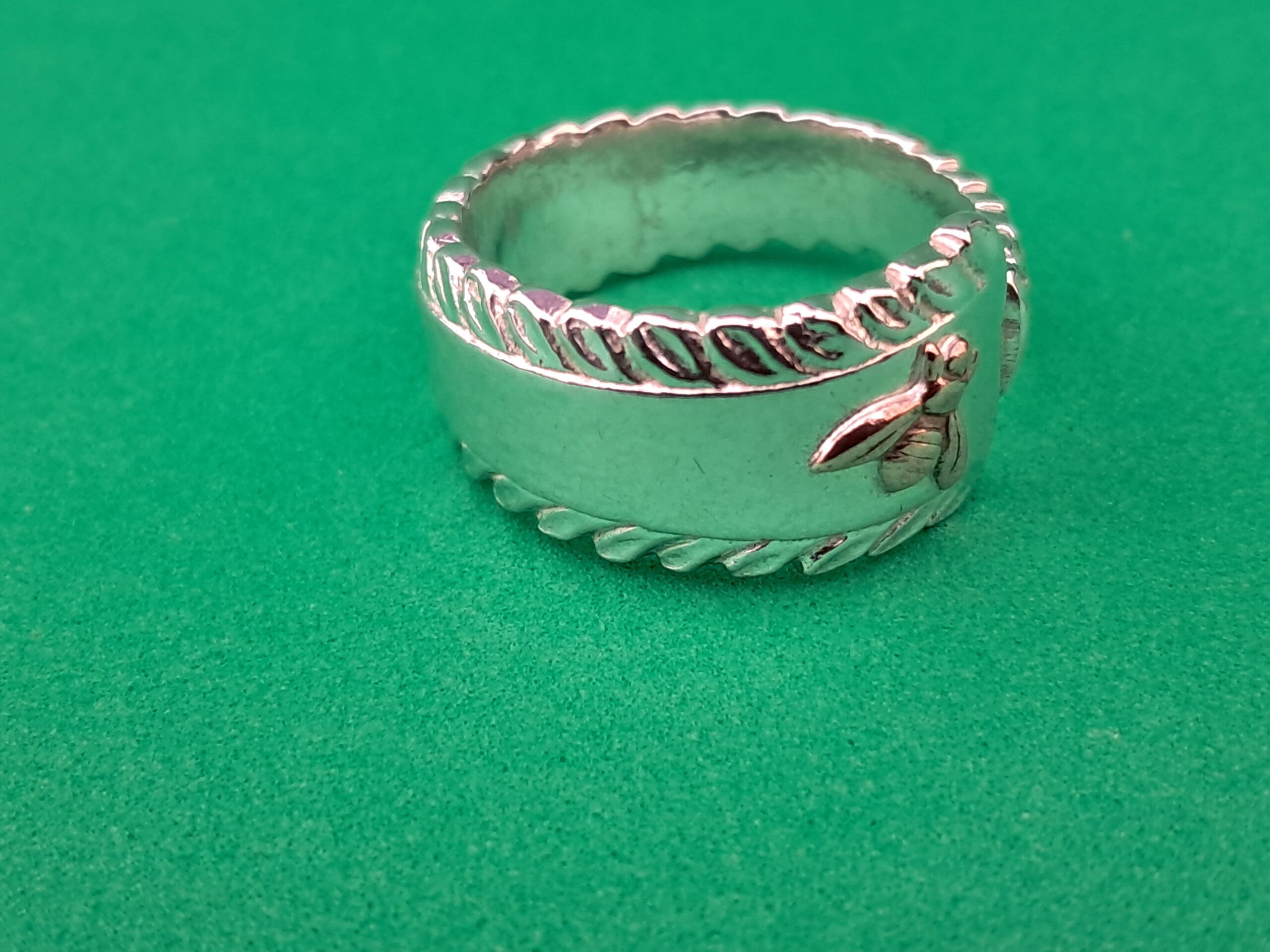 On the inside of the ring, the maker’s initials “JJ” and the sterling silver mark “925” are stamped, confirming its authenticity and silver purity. As a distinctive finishing touch, a copper bee has been affixed to the top of the handle, adding a charming and whimsical detail to the ring’s overall look.