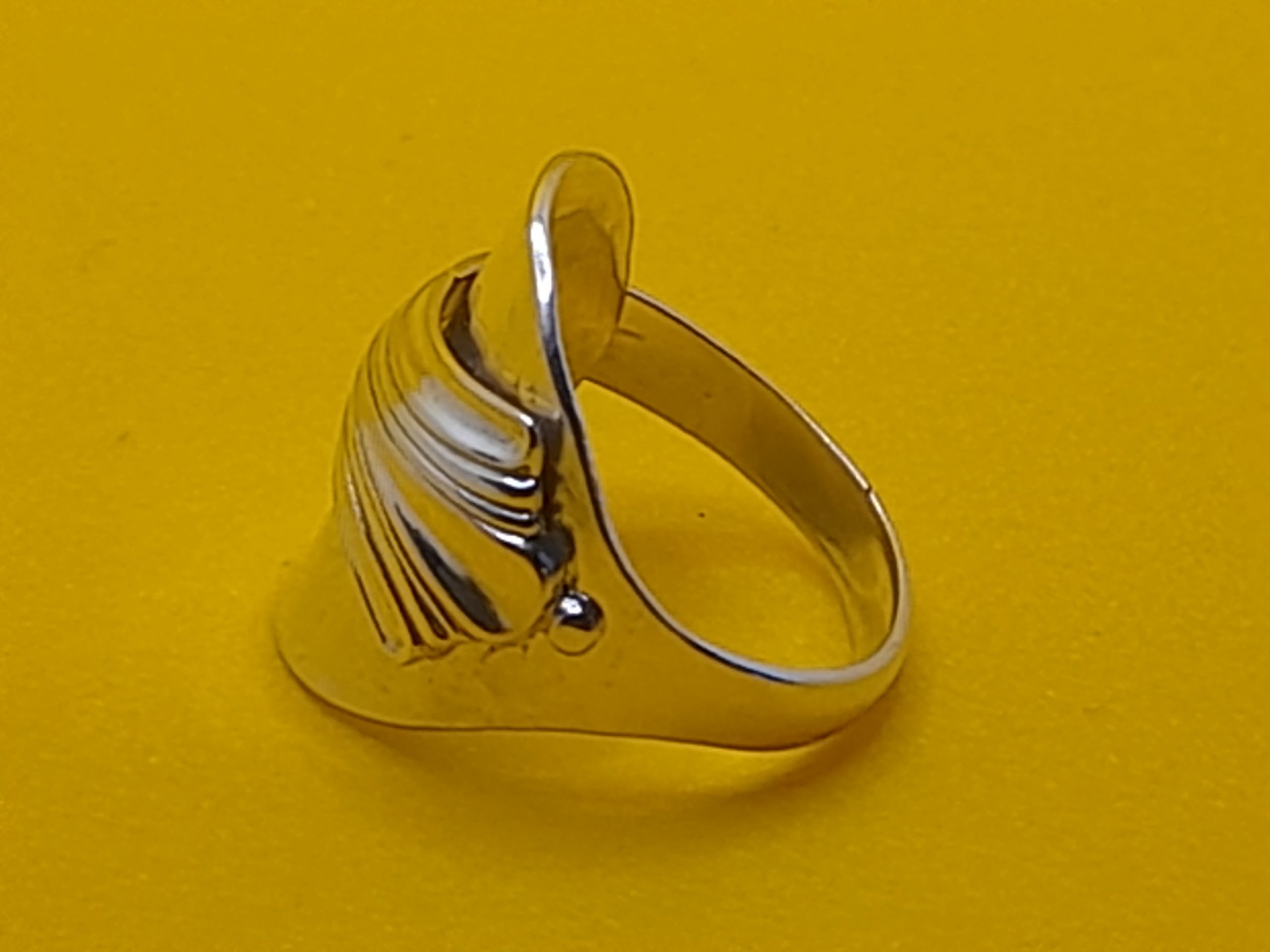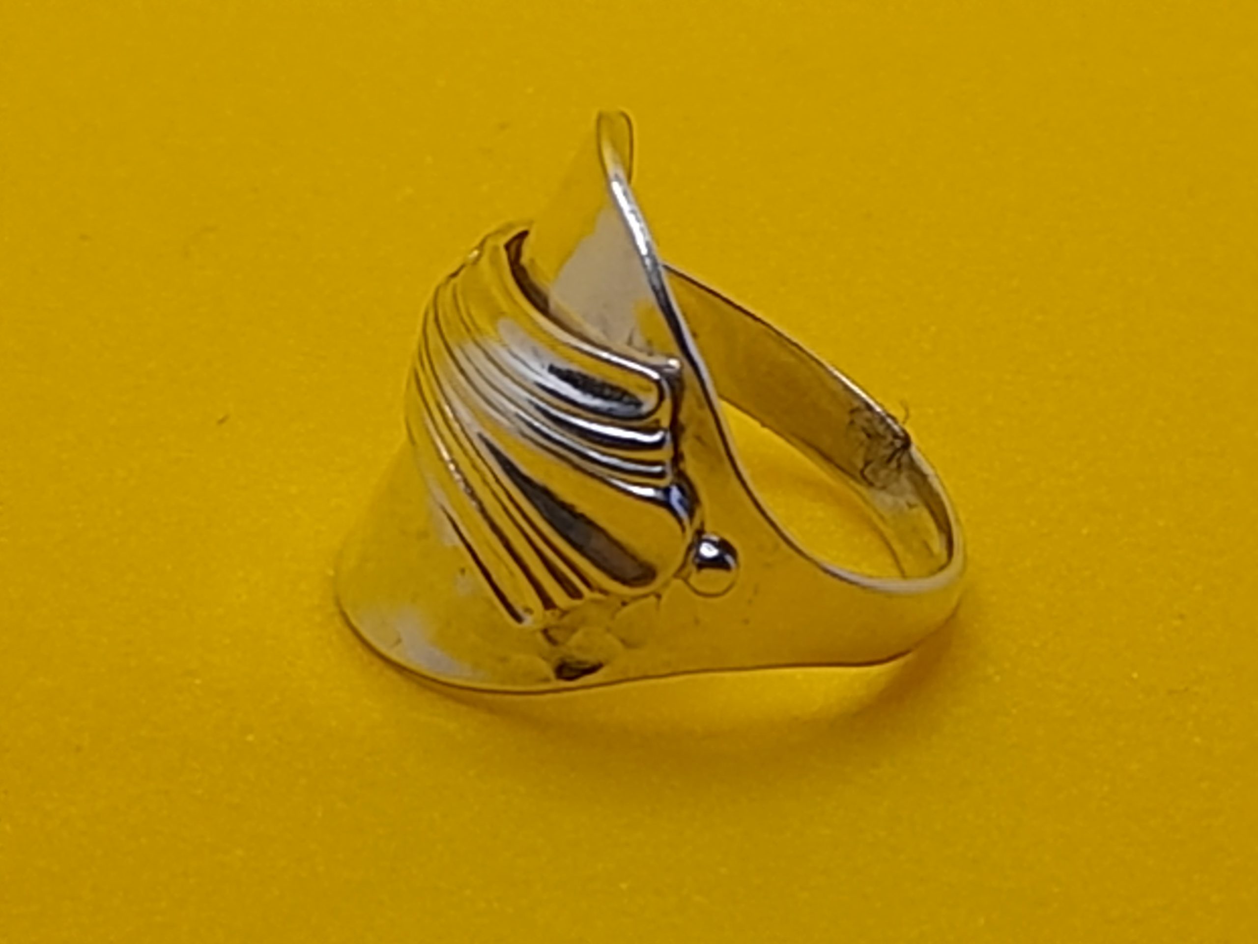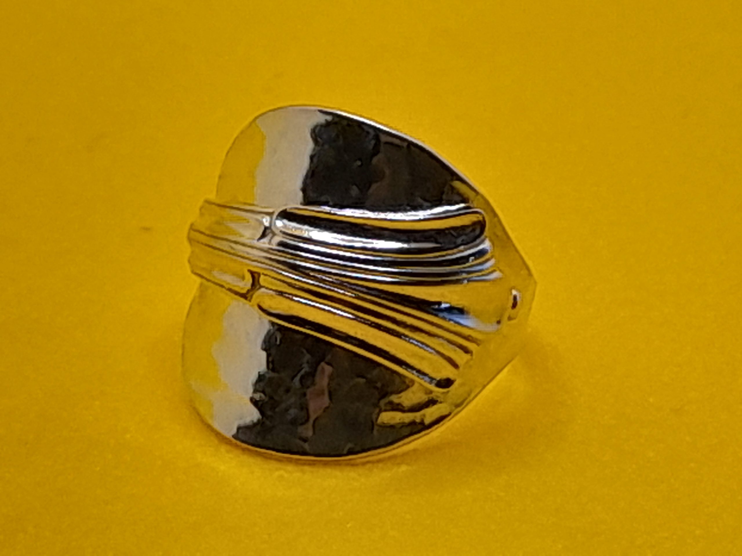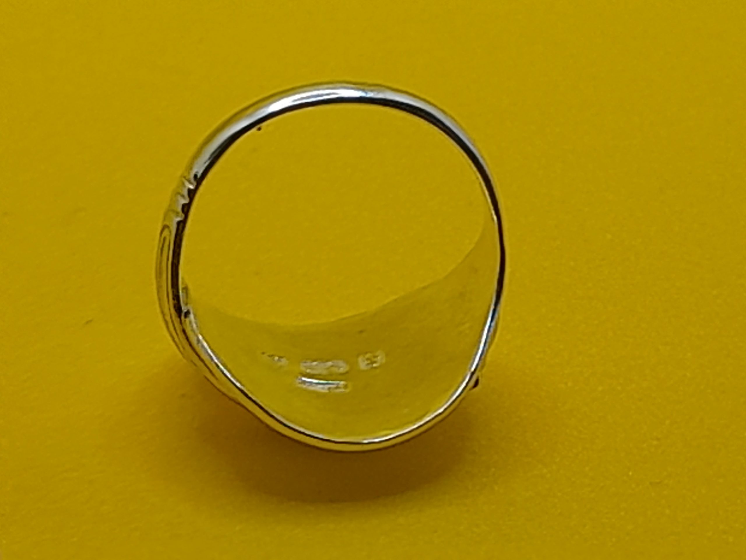 This distinctive sterling silver ring is carefully crafted from an antique salt spoon, featuring the elegant Albany handle design. The bowl of the spoon showcases a unique hammered texture, adding visual interest and a subtle shimmer to the piece. The original salt spoon dates back to Birmingham and was made during the coronation year of Edward VII, 1901–1902, giving the ring a notable historical provenance. Sized as a small pinky ring (Size J), this piece is perfect for those who appreciate delicate, vintage-inspired jewellery with a story to tell.